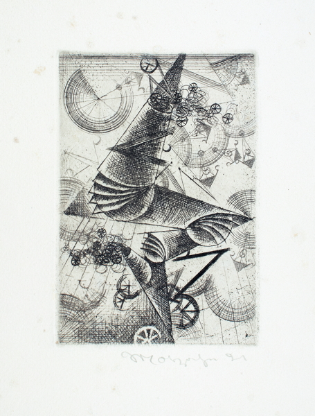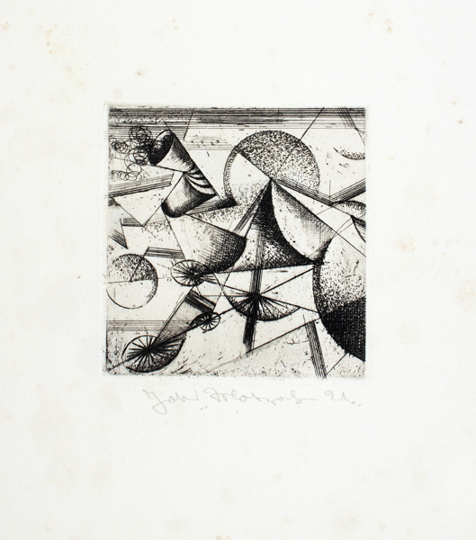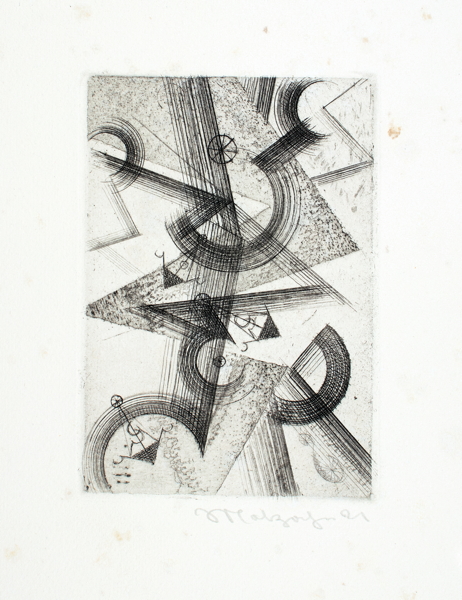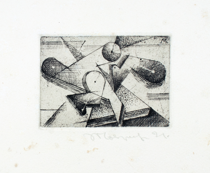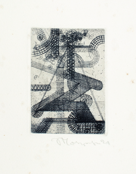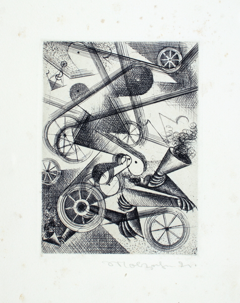 Unnummeriertes Exemplar außerhalb der teils namentlich dedizierten Auflage von 50 Exemplaren, laut Notiz des Vorbesitzers aus dem Nachlass von Walter Dexel. – Ediert als Mappe XII der Ausgaben der Galerie Flechtheim. – Mit zwei Textblättern (Titelblatt, das zweiseitige Vorwort von Wilhelm Uhde, von ihm mit Rotstift signiert, und der Editionsvermerk, signiert von Molzahn. – Die dreifarbig lithographierte Originalhalbleinenmappe enthält folgende sechs Radierungen: Grundriß der Mechanik und Festigkeitslehre. – Industrie-Denkmäler. – Atom-Zerstäuber, die neue Kraftzentrale. – Konstruktion eines Milchstraßen-Elevators. – Höhen-Lokomobilchen. – James Watt, dem Erfinder der Dampfmaschine. Alle signiert und datiert, auf schwerem Kupferdruckbütten. – Wilhelm Uhde in seiner Vorrede: »Molzahn ist Revolutionär, der die Tradition haßt, der dem Gewesenen das Recht bestreitet, mit Ansprüchen in die heutige Welt hineinzuragen und irgendwie Geltung zu haben. […] Man hat das Gefühl, als strebe Molzahn zu einem gewissen Amerikanismus. Aber er kann aus seiner deutschen Haut nicht heraus. Ich werde das Empfinden bei ihm nicht los, als bekämpfe er alle Romantik und Sentimentalität, alles Gemüt und Gefühl so sehr, weil es ihm gefährlich werden könnte. Etwas aber tritt ganz deutlich bei ihm zu Tage: die deutsche Gedanklichkeit. Aus dieser, nicht aus dem Sinnlichen, wächst seine Kunst.«