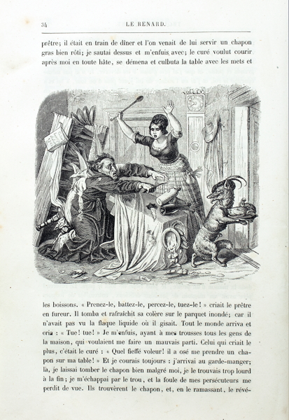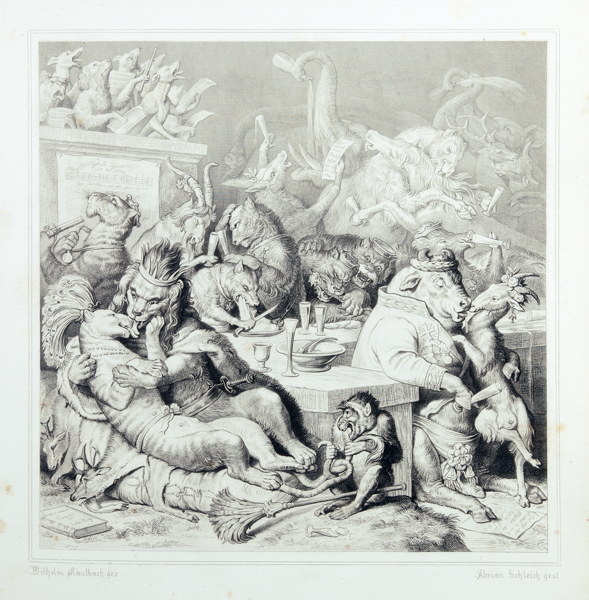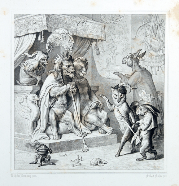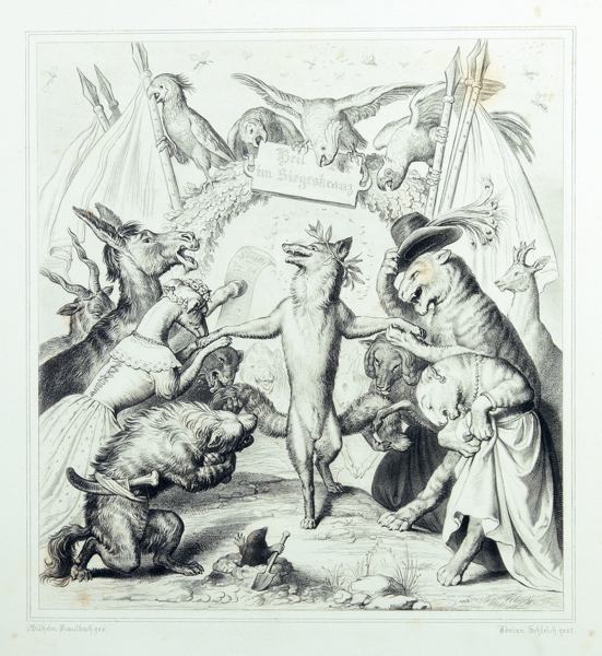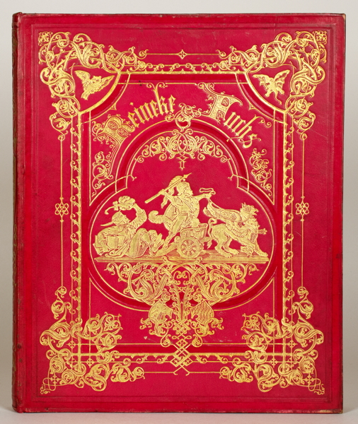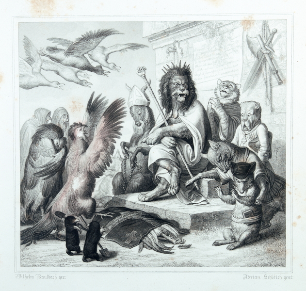 Erste Ausgabe mit Kaulbachs Illustrationen, mit dem Titelblatt des Cotta Verlages. – »Angeregt vermutlich durch die karikaturistischen Tierdarstellungen Grandvilles kleidet Kaulbach die Tiere in meist eindeutig standesbezogene Kostüme und stattet die Bildszenen mit zahlreichen spitzen Anspielungen auf die Politik und das gesellschaftliche Leben der Zeit aus […] Friedrich Wilhelm IV. aber war entgegen allen Befürchtungen begeistert von Kaulbachs Zeichnungen; damit konnten dessen Reineke-Illustrationen unangefochten richtungsweisend für die weiteren Ausgaben des 19. Jahrhunderts werden.« (Fabula docet, Katalog Wolfenbüttel 43, Seite 90). – »Mit einigen Anzüglichkeiten auf seine Zeit und ein paar aktuellen Bosheiten verändert Kaulbach in seinen berühmten Stichen zum ›Reinecke Fuchs‹ Goethes Text.« (Wolfgang Stubbe, in Hauswedell/Voigt I, Seite 74). – Das Werk wurde für Verlag der Literarisch-artistischen Anstalt München gedruckt und erschien ab September 1846 in monatlichen Teillieferungen mit broschierten Umschlägen für Subskribenten. Kalbledereinbanddecken konnten in verschiedenen Farben erworben werden. Im Subskriptionsprospekt von 1846 wurde angekündigt: »Stahlstichprachtausgabe«. – Trotz einiger Alterungsspuren »eindrucksvolles« Exemplar. – Dazu zwei fremdsprachige Ausgaben mit Kaulbachs Illustrationen: Le Renard. Traduction de Edouard Grenier. Illustré par Kaulbach. Paris, J. Hetzel 1867. Mit 35  Textholzstichen und zahlreichen Vignetten. Halblederband der Zeit (beschabt). – II. Reineke-Lis, Poema W. Gëte. St. Petersburg 1902. Mit zahlreichen Illustrationen nach Kaulbach. Originalleinenband. – Beide Übersetzungen erschienen wohl zeitgleich 1861 zum ersten Mal.