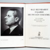 Ein Tafelwerk. Herausgegeben von Hans Rothe. – Die Spielpläne Max Reinhardts 1905–1930. Herausgegeben von Franz Horch. München, R. Piper 1930. Mit einem Porträt und 267 fotografischen Abbildungen auf 128 Tafeln. Ziegelroter Maroquinband mit Linienvergoldung, schwarz-goldenem Rückenschild und Schnittvergoldung.