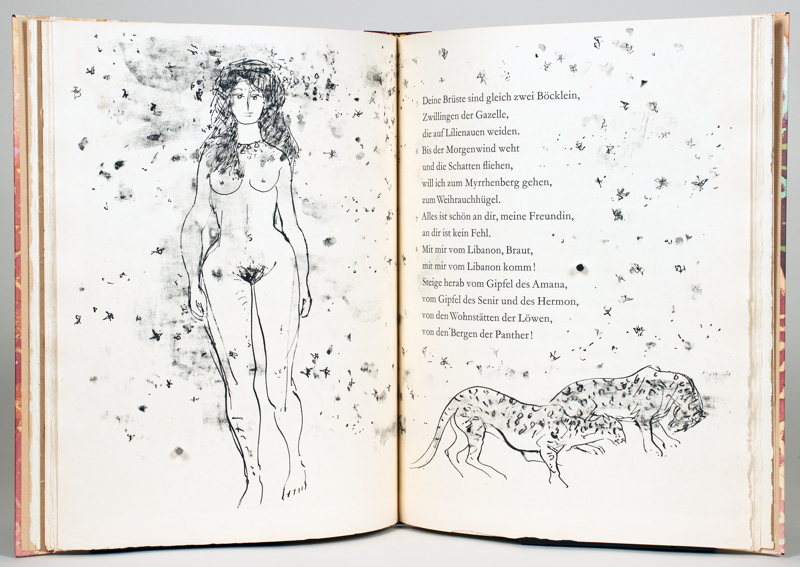 mit Oleaugraphiepapierbezügen. – Inhalt: Das Hohelied von Salomo. Lithographien von Hermann A. Sigg. Zürich, Arta 1968. Mit zahlreichen meist blatt- bzw. doppelblattgroßen Lithographien. Zweifarbig lithographierter Originalumschlag eingebunden.