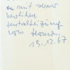 Erste Ausgabe. – Widmung auf Vorsatzblatt: »Dem lieben Richard Tomaselli mit seiner herrlichen Zentralheizung || vom Thomas || 19.12.67«. Richard Tomaselli (1904–1981) war damals seit etwa 20 Jahren am Salzburger Stadttheater engagiert, 1969 gab er dort seine Abschiedsvorstellung. Als arrivierter Schauspieler dürften seine Wohnverhältnisse im Winter 1967 für den jungen Bernhard beeindruckend gewesen sein. – »Verstörung« ist der zweite Roman des 35jährigen Dichters, der kurz zuvor für »Frost« den Bremer Literaturpreis erhalten hatte. Die Startauflage betrug 4.000 Exemplare. – Innen sehr gut erhalten, Schutzumschlag am Oberrand mit winzigen Einrissen.