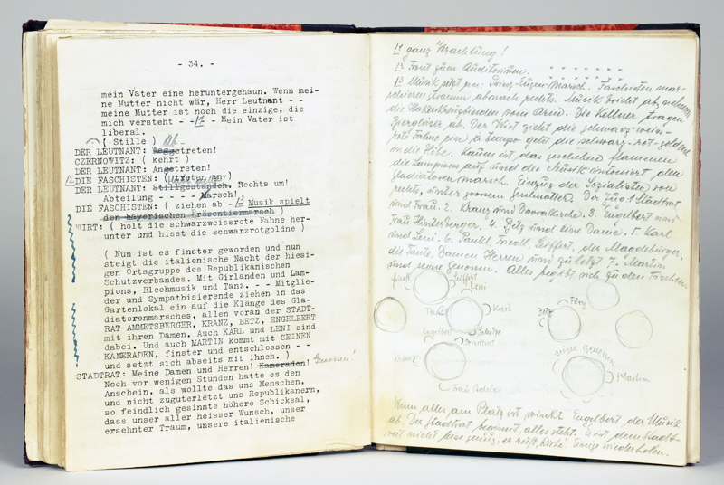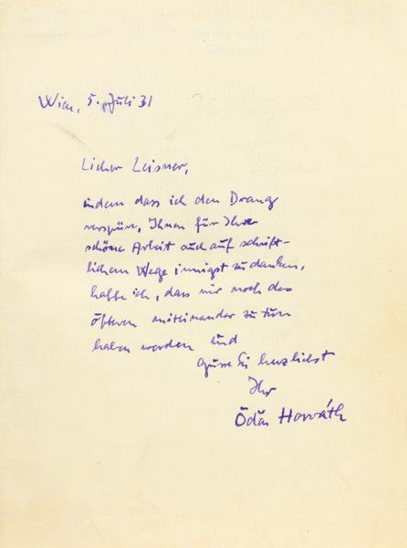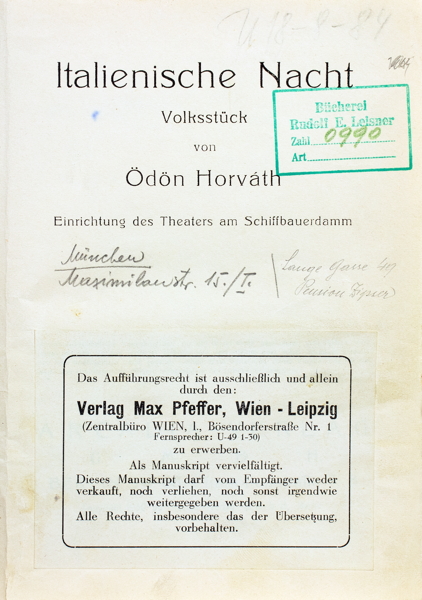 Erstdruck, Typoskriptausgabe. – Titel mit überklebter Verlagsangabe, nun: »Das Aufführungsrecht ist ausschließlich und allein durch den Verlag Max Pfeffer, Wien – Leipzig […] zu erwerben. Als Manuskript vervielfältigt«. – Die Uraufführung von Horvaths Stücke hatte im März 1931 in Berlin stattgefunden, nur wenige Wochen später folgte die »entpolitisierte« Inszenierung Oskar Simas in Wien. – Das Exemplar ist mit 43 zusätzlichen, teils ausfaltbaren Blättern durchschossen, auf denen – neben den Streichungen und Anmerkungen im gedruckten Text – ausführliche Anmerkungen, Bühnenskizzen, Regieanweisungen etc. notiert wurden. – Titel- und Widmungsblatt rückseitig sowie das Personenverzeichnis mit Annotationen zur Besetzung. – Auf dem ersten eingeschossenen Blatt eine lange eigenhändige Widmung des Autors, datiert »Wien, 5. Juli 31«: »Lieber Leisner, indem dass ich den Drang verspüre, Ihnen für Ihre schöne Arbeit auch auf schriftlichem Wege innigst zu danken, hoffe ich, dass wir noch des öfteren miteinander zu tun haben werden und grüsse Sie herzlichst Ihr Ödön Horvath«. – Titelblatt mit Stempel »Bücherei Rudolf E. Leisner« sowie einer Münchner Adresse (Maximilianstr. 15) und der Anschrift der Pension Zipser in Wien (Lange Gasse 49). – Rudolf E. Leisner war Theaterdirektor in Wien, später in Salzburg und am dortigen Mozarteum unter anderem Lehrer von Thomas Bernhard. – Die erste öffentliche Ausgabe erschien 1931 im Berliner Propyläen-Verlag. – Horvath thematisierte die Folgen einer zersplitterten und zerstrittenen Linken und daraus resultierende Erfolge der Faschisten. – »Zur Premiere am Schiffbauerdamm lud Aufricht auch politische Gegner ein, ›den Gauleiter Hinkel und den Schriftsteller Arnolt Bronnen, der frühzeitig zu den Nationalsozialisten übergewechselt war … Die beiden Nazis ließen sich nicht provozieren. Sie applaudierten wie die anderen Zuschauer der erfolgreichen Uraufführung. […] Alfred Kerr nennt bei späterer Gelegenheit das Stück den ›besten Zeitspaß dieser Läufte‹.« (zitiert nach Hildebrandt, Horvath, 1975, S. 65).