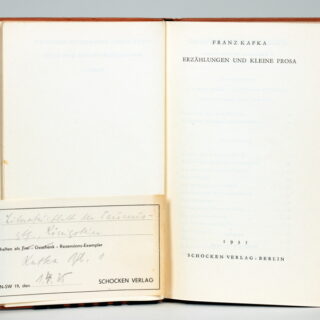 Erste Ausgabe des Erstlings. – Eines der seltenen Exemplare mit der ursprünglichen Angabe »Selbstverlag des Verfassers«, spätere Exemplare erhielten eine Einklebung »Verlag Robert Meier / Leisnig i. Sa.«, wobei es sich dabei um den Gärtner der Familie Jünger handelte. – Provenienzexemplar ersten Ranges: Aus dem Besitz von Ernst Jünger mit Exlibris und dem roten »EJ«-Stempel, darunter eigenhändig mit »Archiv« bezeichnet. Ferner Besitzvermerke von Erwin Warneken (Finanzkaufmann in Shanghai, 1898–1973, eigenhändig und Stempel) sowie eine eigenhändige Widmung Ernst Jüngers, »ex: 2.1.1967 [1968] Herrn Dr. Walz mit guten Wünschen für das Jahr 1968 || Ernst Jünger«. – Dazu: Brief Erich Jüngers mit Unterschrift. Wilflingen, 2.1.1968. Auf Jüngers Briefpapier. An einen Sammler: »Die Leiden des Bibliophilen, der ein Rarissimum sucht, sind mir aus Erfahrung bekannt. Ich lege Ihnen daher ein Exemplar der Erstauflage meines ersten Buches bei, die in der Tat selten geworden ist. Dieses Stück kam von einem Regimentskameraden über China an mich zurück.« – Bei dem Vorbesitzer handelte es sich also um den blutjungen Erwin Warneke (1898–1973), der nach dem Krieg als Finanzkaufmann in Shanghai tätig war. Wann er sein Exemplar an Jünger zurückschickte, ist nicht bekannt.
