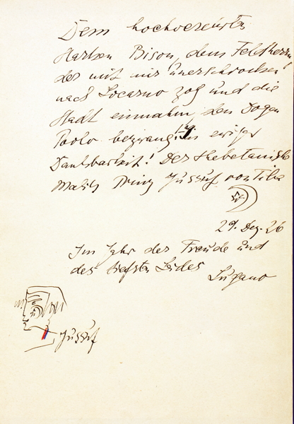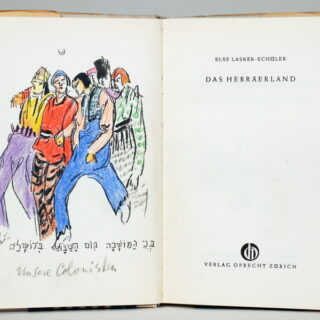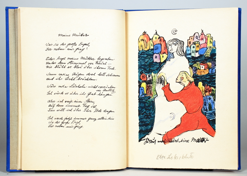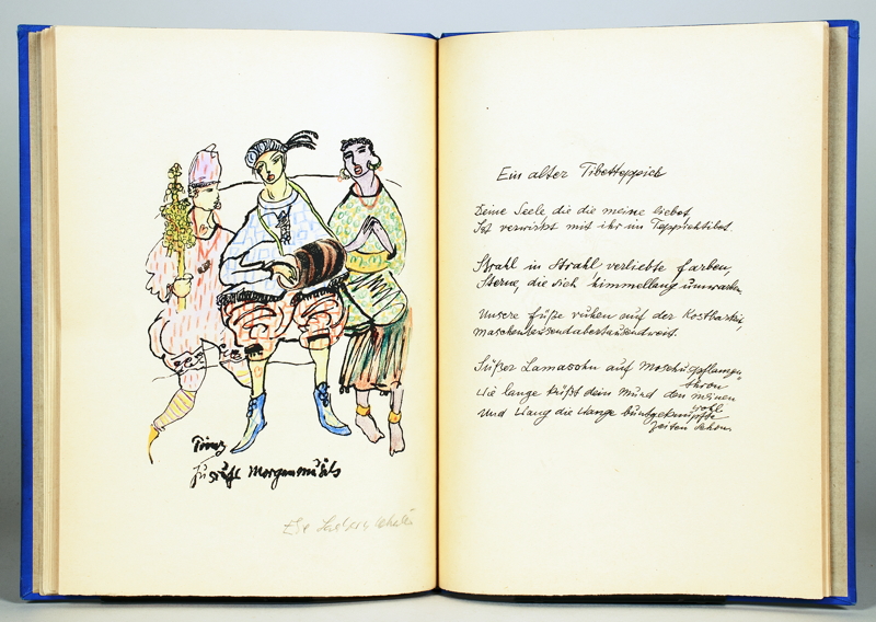 24. Druck der Galerie Flechtheim. – Erste Ausgabe. – Eins von 200 nummerierten Exemplaren, hier allerdings wie die 50 Vorzugsexemplare mit kolorierten Lithographien. – Alle zehn Lithographien und der Druckvermerk wurden von der Dichter-Künstlerin signiert. – »Ich schrieb die Verse dieses Buches und zeichnete die Bilder dazu auf den Stein« (Druckvermerk). – Mit langer, eigenhändiger Widmung der Dichterin »Dem hochverehrten starken Bison, dem Feldherrn, der mit mir unerschrocken nach Locarno zog und die Stadt einnahm, den Dogen Paolo bezwang! In ewiger Dankbarkeit! Der thebetanische Malik Prinz Jussuf von Tiba [?] || 29. Dez. 26 || Im Jahr der Freude und des tiefsten Leides Lugano || [Porträtvignette] Jussuf«. – 1923 hatte die Dichterin das Buch noch »Paolo Pedrazzini, dem Dogen von Locarno«, gewidmet, einem dreißigjährigen Halbmexikaner, zu dem sie während ihres ersten Tessinaufenthaltes in Liebe entbrannt war, wenn er auch »ganz ganz ganz unantastbar« für sie blieb. – »Die zehn Gedichte, die zu den schönsten der Dichterin gehören, stammen aus verschiedenen früheren Sammlungen und sind mit ihrem Familien- und Freundeskreis eng verbunden. […] Die wichtigsten Gestalten, die die private Phantasiewelt der Künstlerin bevölkern, ziehen in Text und Bild durch das Werk, in schnellen, nervösen, eigenwilligen Zügen in Silhouetten gezeichnet, die sich von der Realität entfernt haben.« (Papiergesänge). – Das sicher schönste Buch der Dichterin, das Text, Bild und Handschrift auf das Eindrücklichste vereint. – »Aber eine gibt es, die niemals sterben wird – niemals […]« (Arnold Zweig über Else Lasker-Schüler, 1926, zitiert nach Jentsch). – Als Blockbuch mit Kordelheftung gebunden. – Tadellos erhalten.