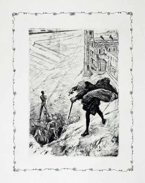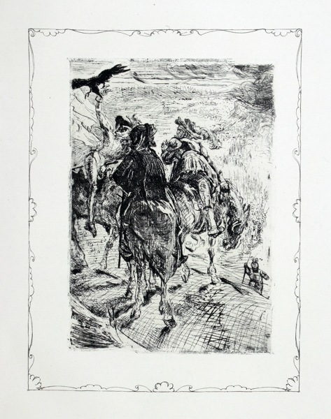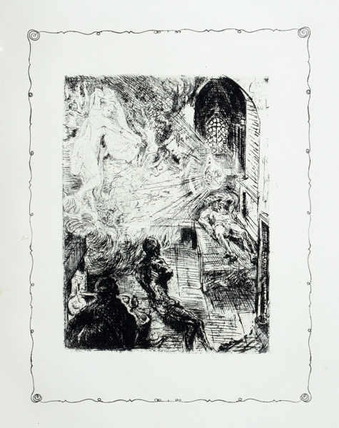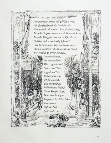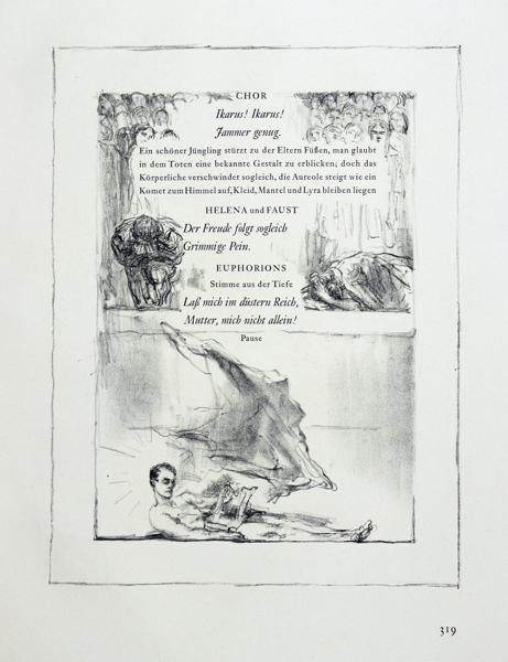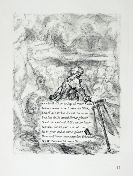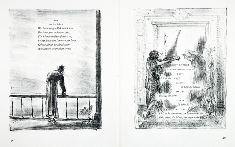 Eins von 250 nummerierten Exemplaren. – Im Druckvermerk von Max Slevogt signiert. – Vollständig in vier Lieferungen, jede im originalen Umschlag, dieses Exemplar jedoch ohne die Zwischentitel und das erst abschließend ausgelieferte Titelblatt. – Beiliegend die großformatige Subskriptionsankündigung. – Slevogts monumentales Illustrationswerk, ein »Werk, das immer wieder zum Blättern und Betrachten verlockt, ein ›Bilderbuch‹ für Erwachsene« (Jürgen Eyssen). – Karl Scheffler beschrieb 1931 ausführlich den Entstehungsprozess: »Am unvergesslichsten werden mir stets die langen Monate sein, in denen Slevogts ›Faust‹ entstand, dieses merkwürdige Werk mit seinen lithographischen Randleisten, Textillustrationen und Vollbildern, die frei von allen Seiten in die Textzeilen hineinwachsen […] Die Zusammenkünfte fanden in der Regel im Romanischen Café statt.« Dort wurden die Stellen ausgewählt, die illustriert werden sollten, der Text aus Korrekturfahnen ausgeschnitten und arrangiert. Es folgten Probedrucke, Klebeumbrüche, Andrucke der Texte, Montage der Lithos und erneuter Text- und schließlich Graphikeindruck. »Es war ein langer Weg, immer wieder mußte verglichen und verbessert werden. Der dabei notwendige Verkehr mit dem Künstler, Verleger, Lithographen und Buchdrucker gehörte jedoch zum Anregendsten, was man sich vorstellen kann« (Imprimatur, NF VII, Seite 139ff.) – Provenienz: Sammlung Ortwin Rüttger, Münster. – Vom Vorbesitzer erworben in unserer Auktion 26, KatNr. 288.