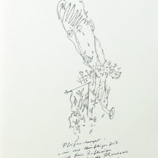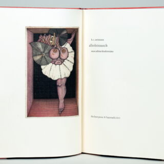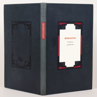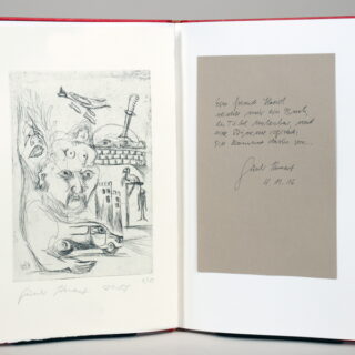 33. Druck der Bear Press Wolfram Benda. – Mit vier blattrgoßen Widmungszeichnungen des Künstler auf Vor- und Nachblättern. – Eins von 20 nummerierten Vorzugsexemplaren (Gesamtauflage nur 65), jedoch in der Ausstattung der zwölf römisch nummerierten der Luxusausgabe mit dem elften Holzschnitt als Frontispiz, Vorblatt mit eingeklebter Gouache (signiert, datiert, 10 : 15 cm), je ein zusätzlicher einfarbig blauer Abzug des ersten und letzten Holzschnitts eingeklebt vor und nach dem Text, der Einband zwar in Weinrot wie die Vorzugs-, jedoch mit einer Emaillearbeit wie die Luxusexemplare. – Gesetzt aus der Pastonchi-Antiqua, als Blockbuch gedruckt auf Bunkoshi-Japan von der Offizin Haag-Drugulin, Leipzig. – Die Holzschnitte wurden vom Künstler mit Ölfarben handgedruckt. – Mit einem Nachwort von Esteban Fekete. – Tadellos erhaltenes Unikum.