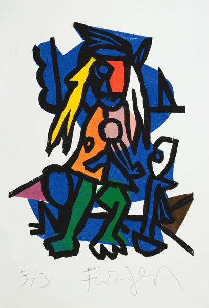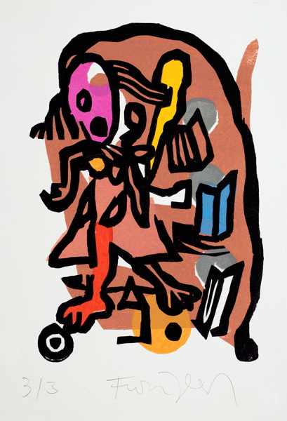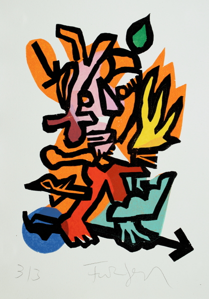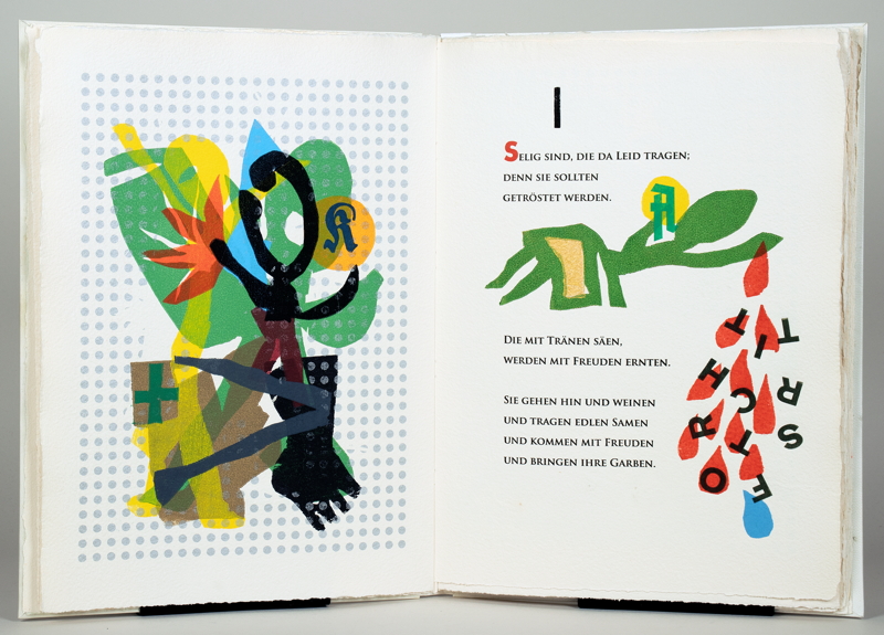 Eins von nur 3 Exemplaren, mit einer beigelegten separaten Folge von 13 Holzschnitt-Varianten (zusätzlich ein Archivexemplar). – Im Druckvermerk vom Künstler signiert und nummeriert. – Unikales Künstlerbuch, es entstanden drei sich in der Farbgebung unterscheidende Varianten. – Handpressendruck auf Zanders-Bütten aus dem Jahr 1954.