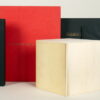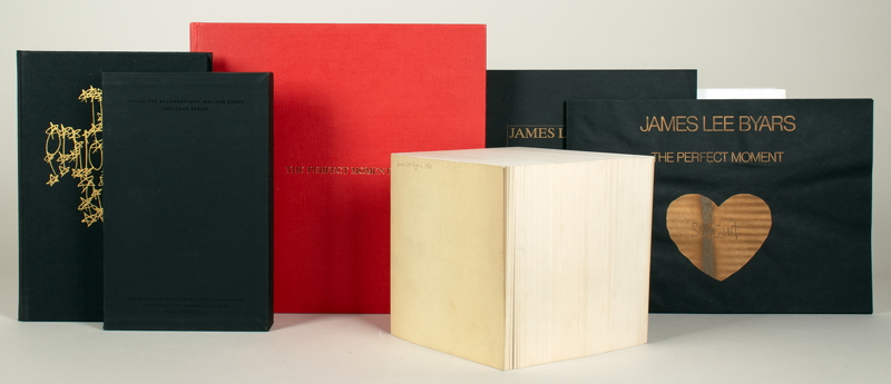 I. James Lee Byars. Katalogbuch Westfälischer Kunstverein Münster 1982. Buchobjekt, Golddruck auf schwarzem Karton. – II. James Lee Byars. Katalogbuch Stedelijk van Abbemuseum 1983. Buchobjekt, etwa 1000 Seiten, davon 2/3 unbedruckt. Auflage 500. – III. James Lee Byars. Katalogbuch ARC, Musée d’art moderne de la ville Paris 1983. Buchobjekt, etwa 300 Seiten, davon 1/3 unbedruckt. – IV. The Philosophical Palace / Palast der Philosophie. Katalogbuch Städtische Kunsthalle Düsseldorf 1986. Herausgegeben von Jürgen Harten. – V. The Golden Tower. Köln, Walther König 1992. Künstlerbuch, perforierte Schrift in schwarzen Kartonblättern. Auflage 333. – VI. The Perfect Moment. Ausstellungskatalog. Valencia 1994. Dazu der Ausstellungsflyer zur gleichnamigen Ausstellung in Bern 1993.