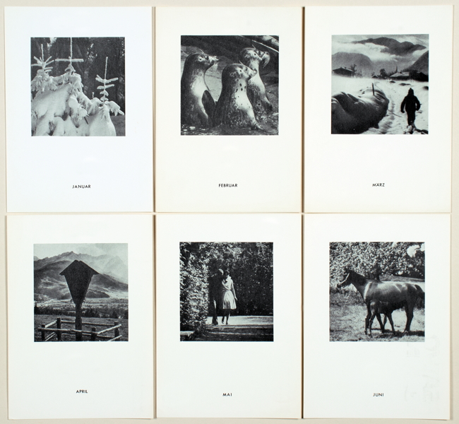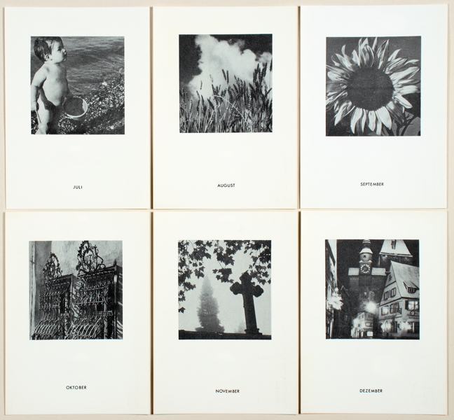 Jede Karte mit einer fotografischen Abbildung zu einem Monat, dessen Name darunter abgedruckt. – Eine vollständige Folge der »Monatskarten« zählt zu den seltesten Stücken in Feldmanns Oeuvre. Die Konzeption sah vor, daß der Galerist Paul Maenz in einer Mail Art Aktion jeden Monat die kleine Auflage der entsprechenden Karte an einen Kreis von Sammlern verschickte, kein Sammler aber alle 12 Karten erhielt. Feldmann wollte so den »Sammlerinstinkt« wecken und erreichen, dass die Bezieher der unvollständigen Bildfolge versuchen, diese selbständig zu komplettieren. – Tadellos erhalten. – Dazu 20 weitere Publikationen.