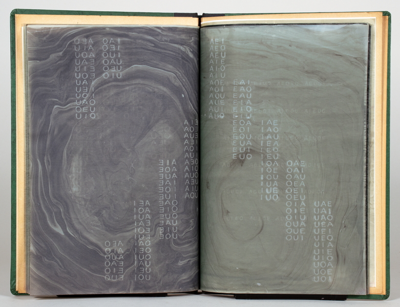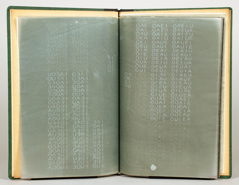 Unikatbuch. – 54 Tuschblätter, vier weiße Blätter, davon eins als Titelblatt. In Leitz-Klemmordner. – Die Tuschebilder entstanden ähnlich einem Oleographiepapier. Farbige Tusche wurde tropfenweise auf Wasser aufgebracht, ein Blatt Transparentpapier aufgelegt und wieder abgenommen. – Wie die ungefärbten Buchstabenreihen entstanden, erläutert der Künstler in seinem Werkverzeichnis (http://www.paul-heimbach.de/Buecher_und_Auflagenobjekte.pdf): »Die Negativschrift wurde hier vor dem Abzug der Farbschicht mit Öl geschrieben, mit dem ein Füllfederhalter gefüllt war. Bei ähnlichen späteren Vorhaben benutzte ich statt des Öls meist wasserabstoßende Stifte.« Durch das Transparentpapier sind die Färbung und die ungefärbten Lettern beidseitig sichtbar. – Im Werkverzeichnis als Buch 88 eine Variante mit nur 37 Blättern.
