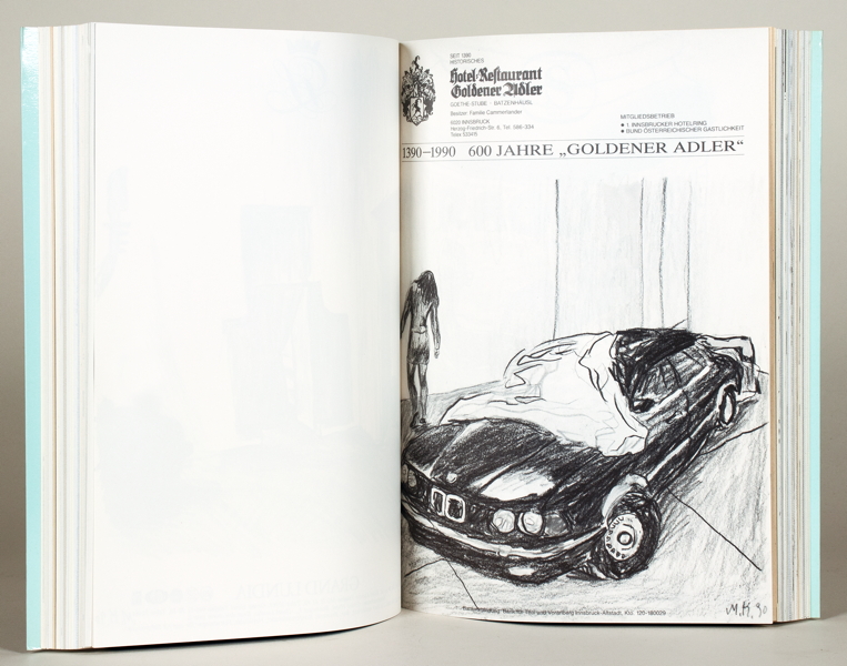Die vollständige legendäre Hotel-Trilogie, erschienen in Auflagen 950, 500 bzw. 750 nummierten Exemplaren. – »Ab 1987 fertigte Martin Kippenberger, der ständig auf Reisen und viel in Hotels zu Hause ist, Hunderte von Zeichnungen auf Hotelbriefpapieren an. Es entsteht eine Art Autobiographie, die rasch festgehaltene Ideen, Pläne und Konzepte zu Arbeiten, Werkzeichnungen zu Installationen, Portraits, Skizzen nach eigenen Photographien und Bildern sowie autonome durchgearbeitete Zeichnungen enthält. Der Briefkopf des jeweiligen Hotels stellt für den Betrachter nicht nur einen örtlichen Bezug her und zeichnet Kippenbergers Reiseroute nach, er wurde von ihm oft auch in die Zeichnungen integriert oder bildete den Ausgangspunkt der Zeichnung. || Um dem Briefpapiercharakter gerecht zu werden, wurden für den Druck unterschiedliche Papiersorten verwendet.« (Uwe Koch). Der zweite Band enthält Zeichnungen aus den Jahren 1991–1995, der dritte, zusammengestellt noch vom Künstler, erschienen aber erst posthum, Briefpapiere ohne Zeichnungen. – Sehr gut erhalten. – Dazu: Uwe Koch. Annotated catalogue raisonné of the books by Martin Kippenberger. Köln 2002.