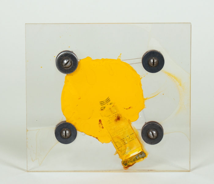 »On Manattan’s Upper West Side, the American Surrealist William Copley had leased a third-floor loft and invited his fellow artists to exercise a collaborative freedom few had experienced before or would experience again. Lew Syken, the project’s chief designer, remembers the SMS studios as a place where ›it was impossible to anticipate what would happen next‹« (Art in Real Time, Carter Redcliff). – Dazu: Arman Fernandez. Tortured Color. Multiple (Farbtube, Farbe, Acrylclas, Schrauben). 1968. 12,5 : 14 : 2,5 cm. Dublette von Fernandez’ Beitrag zu SMS 4, bestimmungsgemäß zusammengebaut. Kenntnisreiche Flohmarktentdeckung des Vorbesitzers.